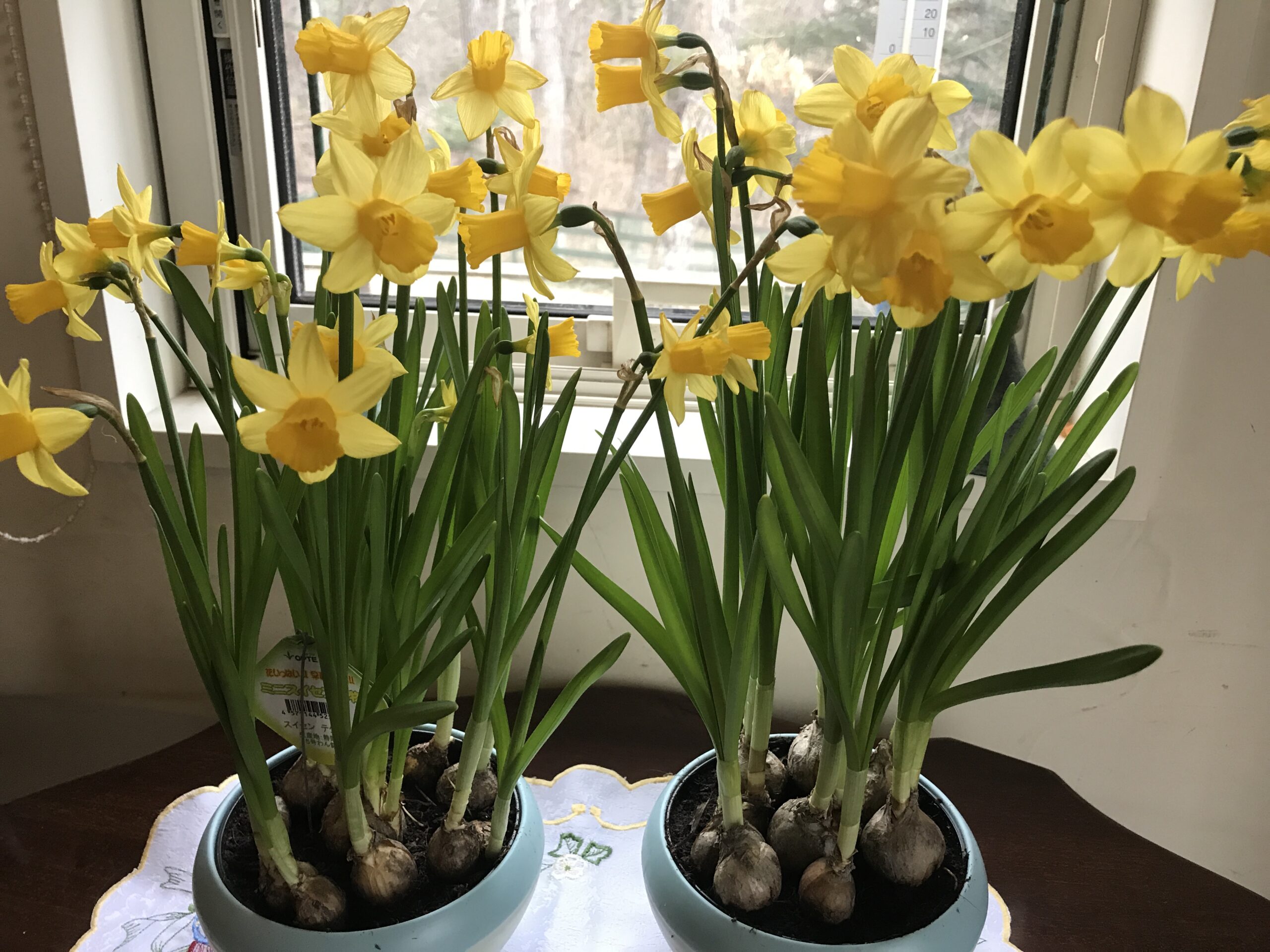 窓辺では、ひと足早く黄色のラッパスイセンが元気よく咲いています。